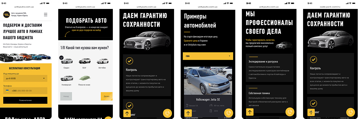 Провести интервью с клиентом и проанализировать как упакованы компании на рынке пригона авто. Создать логотип, фирменный стиль и сайт Unity Auto.