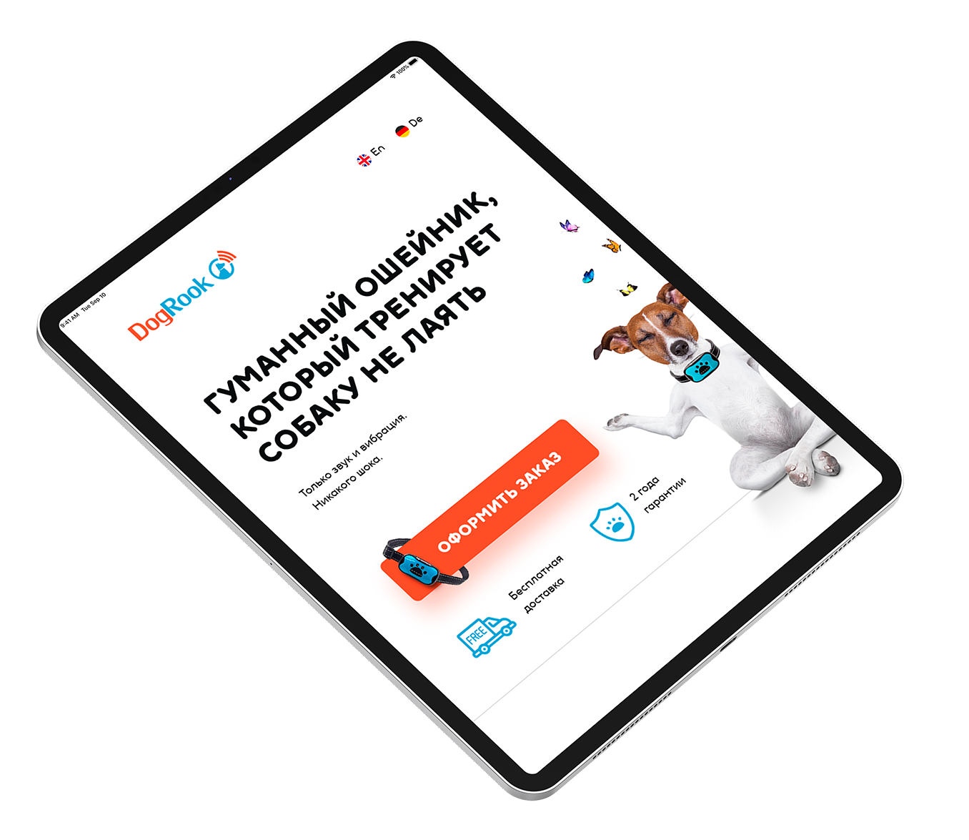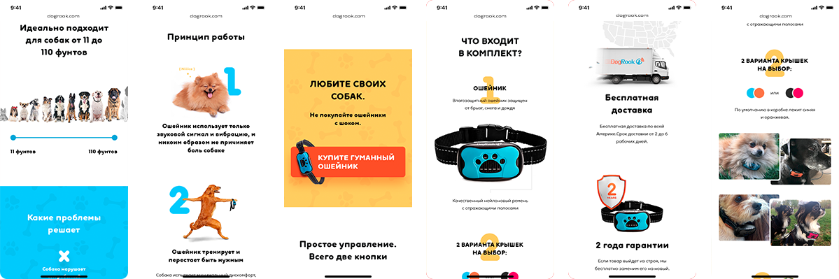 С первого экрана мы говорим о том, что ошейник использует только звук и вибрацию, без электрошока и других раздражителей, которые угнетают собаку.