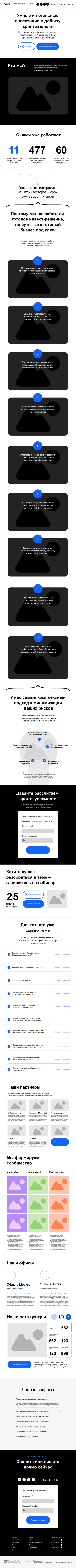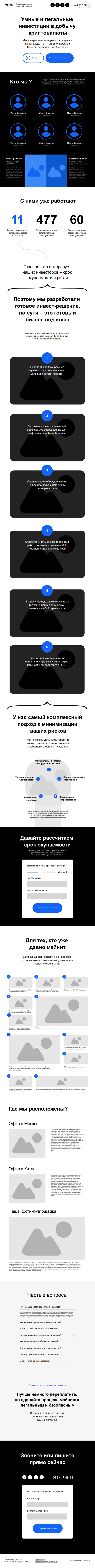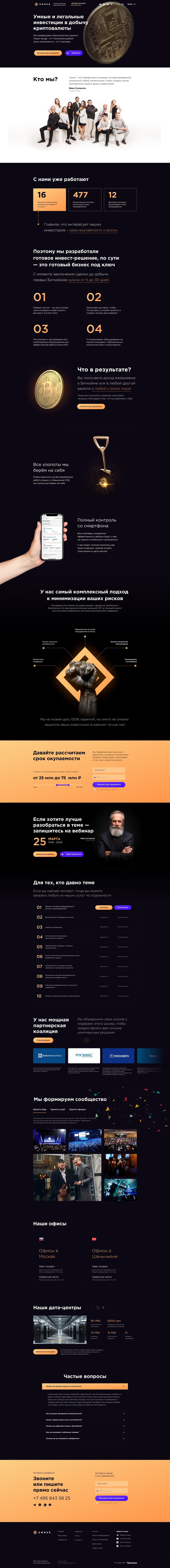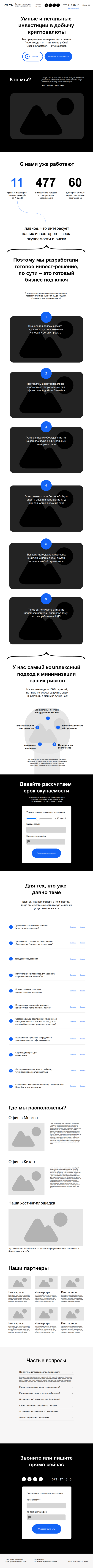 Создали инструмент для привлечения инвесторов в добычу криптовалюты. На лендинге раскрыли преимущества предложения, понятно рассказали о условиях сотрудничества и комплексном подходе компании, который минимизирует риски, чтобы потенциальный клиент мог взвесить все «за» и «против» и сделать выбор в сторону Umnus.