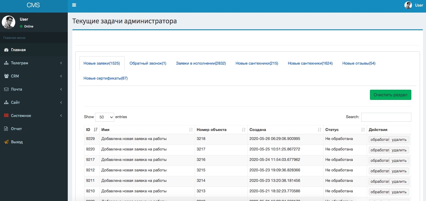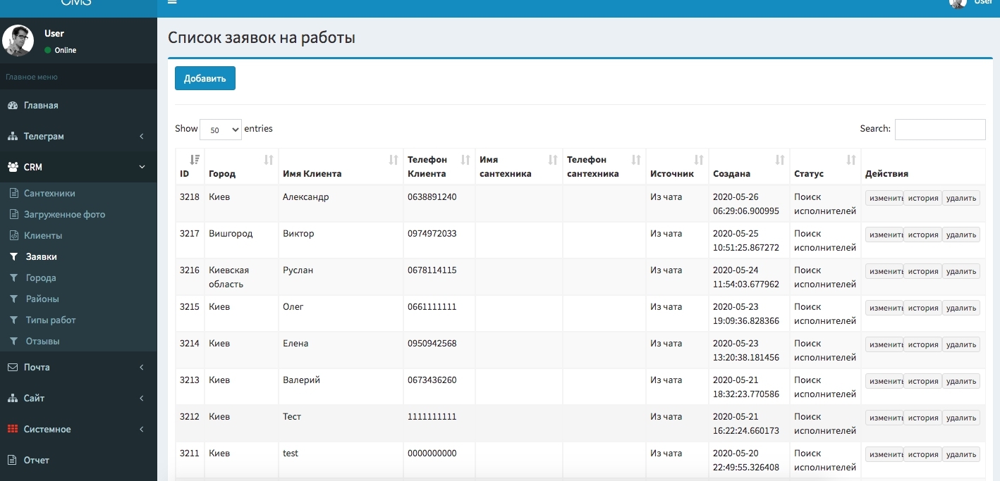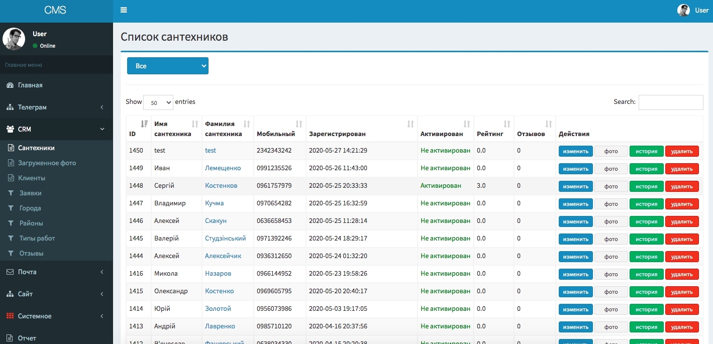 Разрабатываем программную часть сервиса, с понятной админ панелью для удобного администрирования портала. Особого внимания заслуживает внутренняя СRM, которая позволяет в одном месте хранить все данные о сантехниках, все заказы и статусы их выполнения.