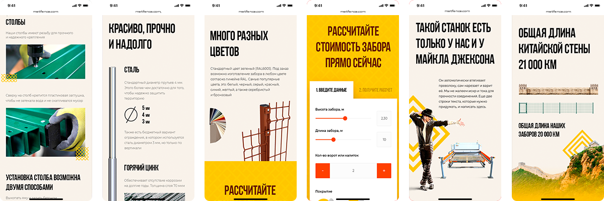 Интервью и исследование + создали логотип и фирменный стиль + написали тексты и разработали прототип лендинга по ограждениям + дизайн лендинга по ограждениям + адаптация дизайна под мобильные устройства + подготовка к переходу на технический этап + верстка и анимация + программирование и админка + интеграция с СRM и айпи-телефонией + тестирование и оптимизация + обучение клиента админке + создание контента для рекламы + создание лендингов для 4-х других продуктов + перевод лендингов на 5 языков + техническая поддержка.