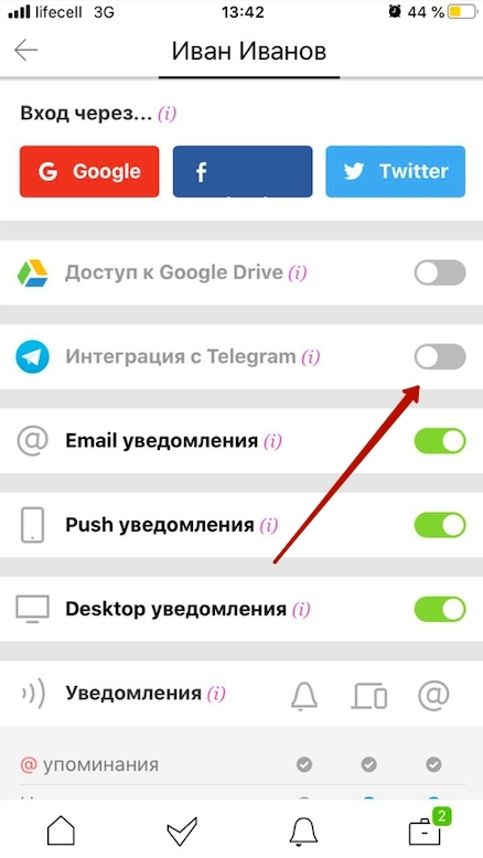 Также рекомендуем вам включить связь с Telegram в приложении, чтобы ничего не потерять и не забыть (работает как хорошая напоминалка). Для этого, открываете настройки вашего профиля и находите соответствующий пункт. В Telegram, вам просто нужно будет запустить сам бот.