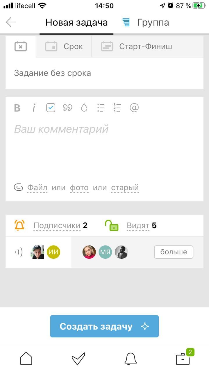 После выбора проекта, заполните заголовок задачи и установите срок её выполнения. Если уже понятны какие-либо детали задачи или нужно прикрепить файлы используйте область для комментариев. После, нажимайте кнопку «Создать задачу» и мы сразу получим об этом уведомление.